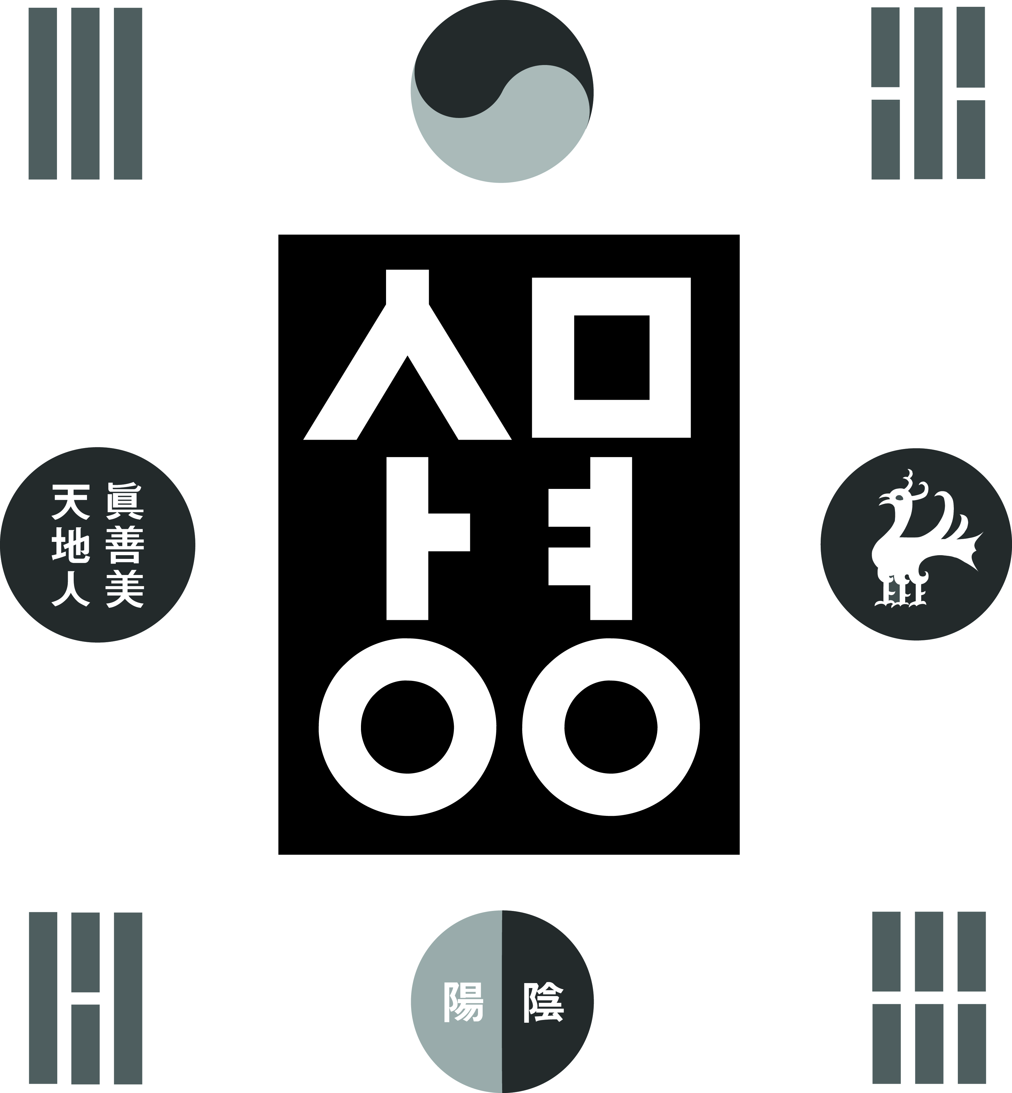 ㅅ ㅏ ㅇ ㅁ ㅕ ㅇ 의 2종열은 음·양을 뜻하고, 3행열은 천·지·인, 진·선·미를 뜻한다. 또한 이를 둘러싼 방형(고구려 고분벽화의 천정형태)은 사방위신인 건·곤·감·리를 뜻하고 있다. 그리고 천지명월, 사방위신을 의미하며, 이는 상명의 창조적 우주관에 기원을 둔다.